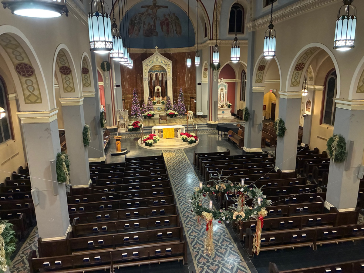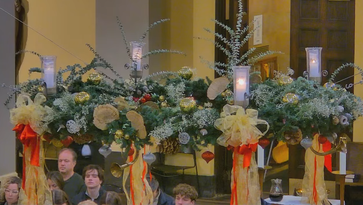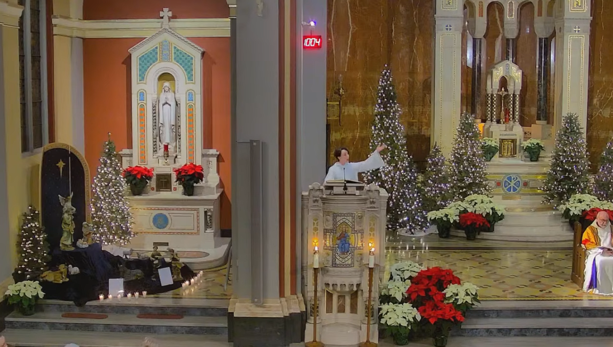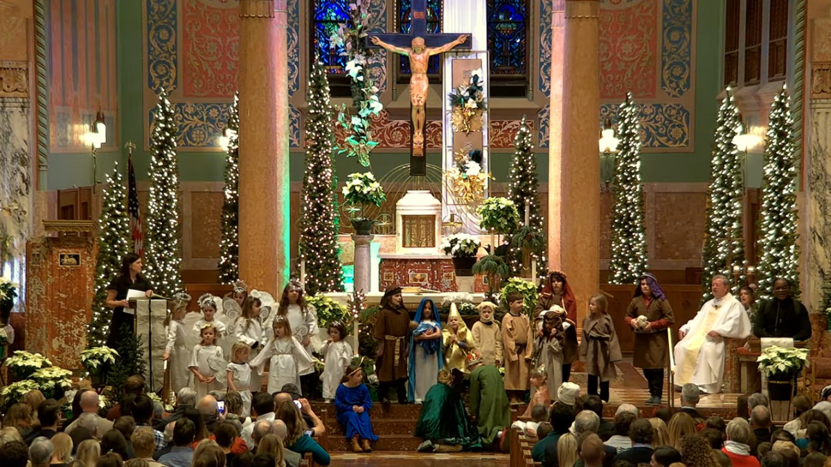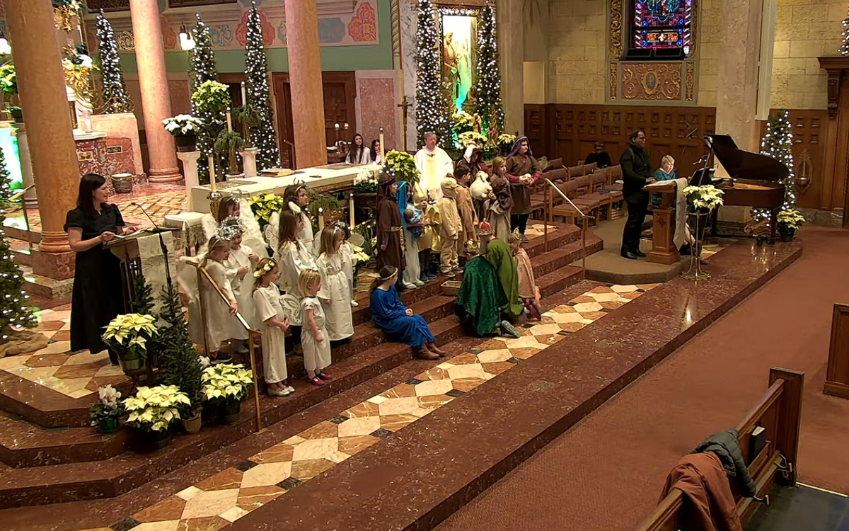One of the Christmas Eve Masses at St. Catherine of Siena-St. Lucy and St. Giles Parish included a children's Nativity enactment, which was livestreamed at 3:00 PM as a family-oriented service. At Ascension and St. Edmund Parish, a traditional Midnight Christmas Mass was celebrated and livestreamed at 11:00 PM, preceded by carols at 10:30 PM. Through these services, featuring the Nativity enactment and carol music, the communities celebrated the birth of Christ and reflected on the gift of salvation and the redemptive purpose of his life.