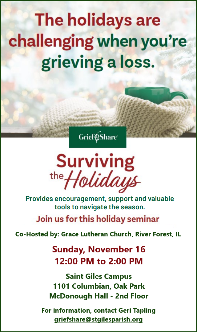 St. Catherine of Siena-St. Lucy and St. Giles Parish sponsors a GriefShare program, a special support group for people dealing with the loss of a family member or a dear friend. At this GriefShare group, you’ll find understanding, guidance, relief, and a safe place to navigate the challenges of grief. We invite you to consider joining us for the next 13-Session Program on Tuesdays from September 16 through December 9, 2025, at St. Giles Campus in McDonough Hall, 1101 Columbian Avenue in Oak Park, IL 60302.