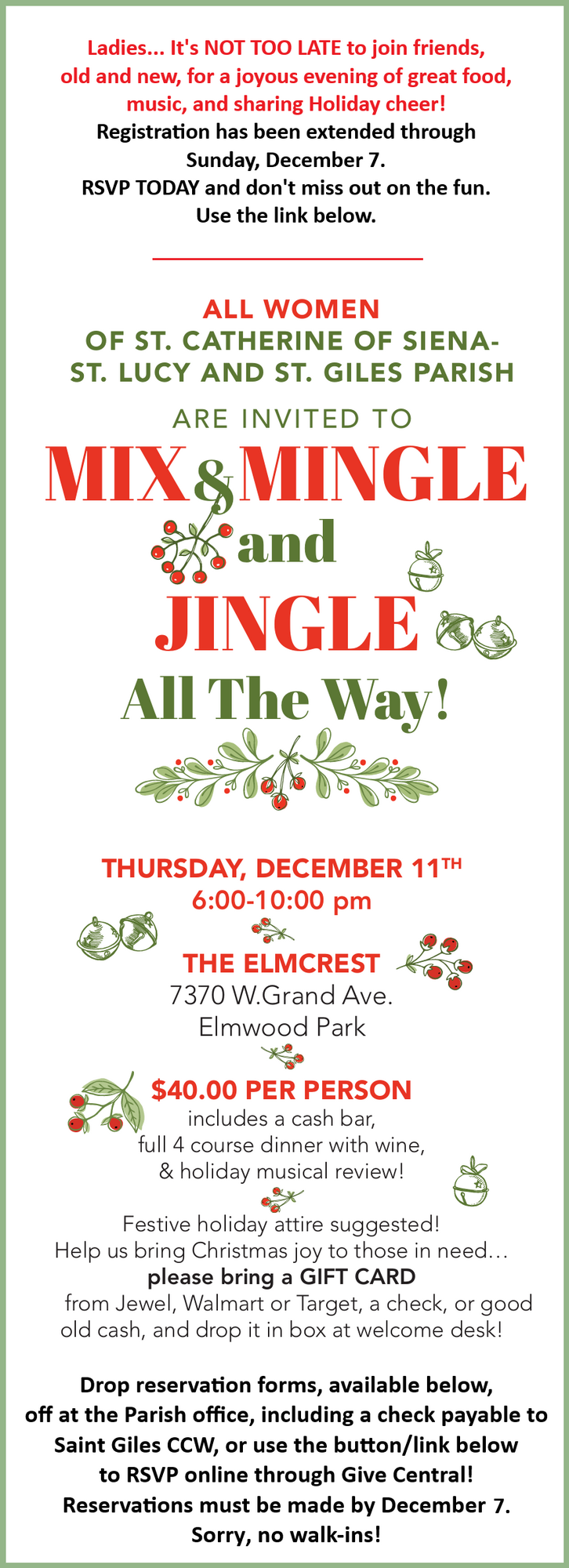 Please contact Jeanne Gallo or or Elsa DePalma if you would like to find out more about this parish group, Women of St. Catherine of Siena-St. Lucy and St. Giles, how to get involved, have questions or ideas…. we welcome you.
